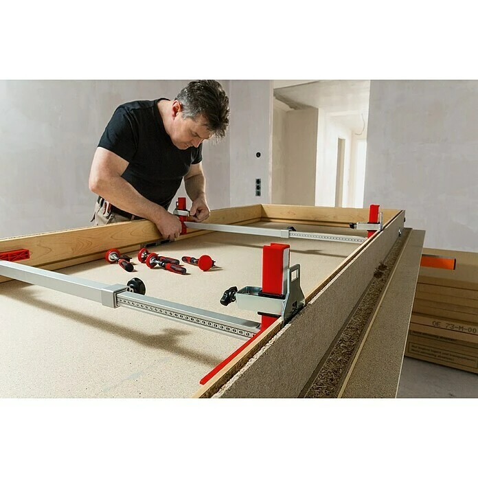 Mit der Türfuttermontagestrebe von Bessey lassen sich Türfutter schnell und exakt Ausrichten. Lästiges Auskeilen und langwieriges Messen entfallen. Die Strebe wir in den eingesetzten Rahmen montiert, anschließend werden die Abstände mittels Stellschrauben ganz einfach eingestellt. Durch das zentrale, teleskopierbare vierkant Rohr aus Aluminium lässt sich das Türfutter dank mm-Skala exakt in der Breite ausrichten. Die kreuzförmigen Druckplatten sind mit Filz überzogen, so werden empfindliche Oberflächen geschont und Beschädigungen vermieden. So bleibt das Türfutter beim ausschäumen exakt in Position, die genaue Breite bleibt erhalten und der Montageschaum hat keine Chance, die Seiten zu verbiegen. Zur Exakten Zargenmontage werden mindestens 2 Türfuttermontagestreben benötigt.