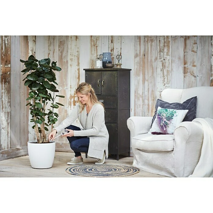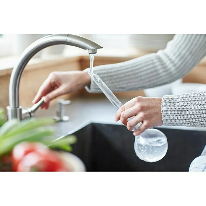 Die Bewässerungskugel Aqua Care von Elho sorgt mit einem Fassungsvermögen von 500 ml für eine gleichmäßige und bedarfsgerechte Bewässerung. Hierfür wird die Kugel einfach mit Wasser befüllt und leicht schräg in die Erde bis unter die Wurzeln gesteckt. Eine Kugel versorgt Töpfe mit einem Durchmesser von 14 – 50 cm. Dank des durchsichtigen Materials kann der Wasserstand jederzeit abgelesen werden. Da die Tülle besonders breit gewählt wurde, kann sie nicht mit Erde verstopfen. Dieses benutzerfreundliche Bewässerungssystem besteht zudem aus bruchsicherem Kunststoff.