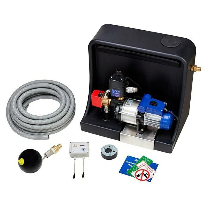 Garantia Technikpaket Haus PROline – geeignet für die Regenwassernutzung in Haus und Garten. Mit dem Zubehörpaket PROline sind Sie auf dem neuesten Stand der Technik. Das hochwertige Trinkwasser-Nachspeisemodul ist eine vollautomatisierte Systemsteuerung Ihrer Regenwassernutzungsanlage und bietet eine besonders geräuscharme und leistungsfähige Marken-Kreiselpumpe. Bei leerem Tank wird über den integrierten Trinkwasser-Nachspeisebehälter, bedarfsgerecht Trinkwasser entnommen und direkt den Verbrauchsstellen zugeführt. Den Überblick über Ihren Wasserstand im Tank bewahren Sie mit der digitalen Füllstandsanzeige. Die schwimmende Entnahme entnimmt das Wasser kurz unter der Wasseroberfläche – im saubersten Bereich. Lieferumfang: Trinkwasser-Nachspeisemodul inkl. 3-Wege-Umschaltventil, integriertem Trinkwasser-Nachspeisebehälter, Pumpenkonsole und Kreiselpumpe mit Schaltautomatik (Motorleistung 0,66 kW, max. Förderhöhe 35 m, max. Druck 3,5 bar, max. Fördermenge 3.600 l/h, max. Sauglänge 15 m, max. Saughöhe 3 m). Schwimmende Entnahme inkl. Schwimmerkugel, Feinfilter, Rückschlagventil und Saugschlauch 3 m. Beschriftungsset zur Kennzeichnung von regenwasserführenden Leitungen, 12,5 m Saugschlauch 25mm (1“) und Mauerdurchführung DN 100.