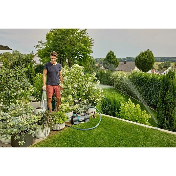 Die Anschlussmöglichkeit für den Gardena Bodenfeuchtesensor (nicht im Lieferumfang enthalten) erlaubt eine optimale Wasserversorgung für Pflanzen, während der Wasserverschwendung vorgebeugt wird. Die wetterfeste Pumpe ist outdoortauglich und kann die ganze Gartensaison über im Freien stehen bleiben, selbst bei Dauerregen und hohen Luftfeuchtigkeiten wie bei Nebel. Das sorgt für kurze, effiziente Wege zur Wasserquelle. Einen sicheren Stand gewähren die Standfüße aus Gummi und damit keine Schmutzpartikel wie Sand in die Elektropumpe gelangen, befindet sich ein integrierter Vorfilter am Eingang.
