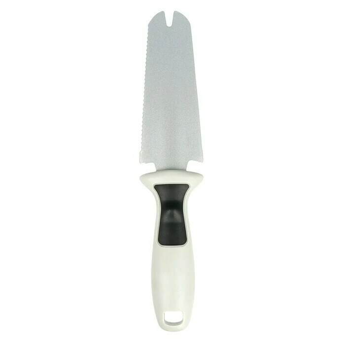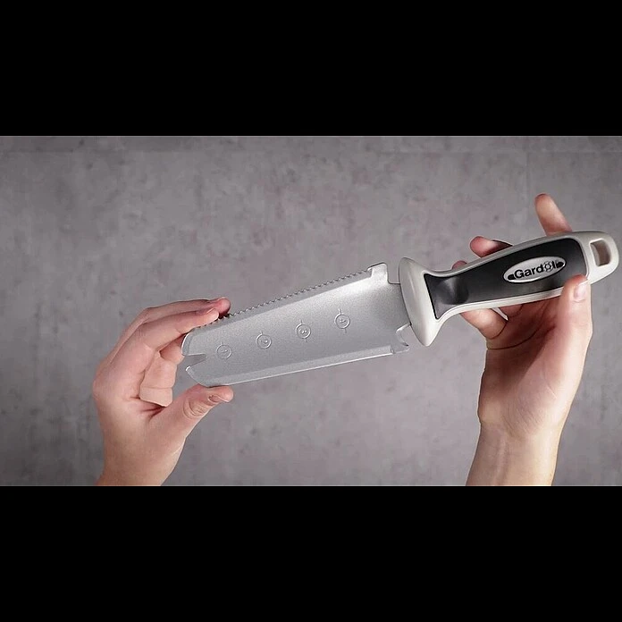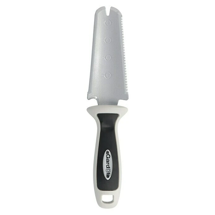 Dieses Multifunktionswerkzeug von Gardol mit Wellenschliff eignet sich zum leichten Durchtrennen von kleinen Wurzeln sowie zum Auflockern harter Böden. Die Schneidkante ermöglicht ein einfaches Trennen von Setzlingen und das Entfernen von unerwünschten Ästen und Blättern am Pflanzgut. Mit der zum Unkrautstecher geformten Spitze lässt sich Unkraut samt Wurzel leicht entfernen. Zudem ist das Multifunktionsgerät mit einem praktischen Draht- und Schnurschneider ausgestattet. Zur Ermittlung der Pflanztiefe besitzt das Werkzeug an der Vorderseite eine Messeinheit.
