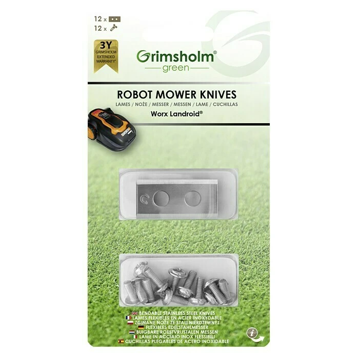Messer für Mähroboter. Sie wurden optimiert nach Stärke, Schärfe und Langlebigkeit für perfekte Schnittresultate. Sämtliche Messer sind biegsam, um zu verhindern, dass abgebrochene Klingenteile im Rasen verbleiben.