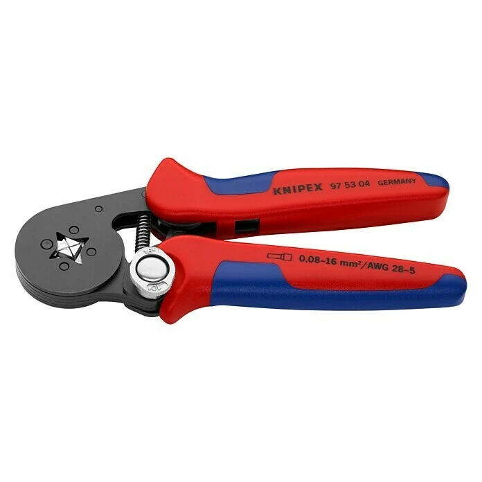 Die selbsteinstellende Crimpzange für Aderendhülsen der Marke Knipex mit Seiteneinführung ist für Vierkant-Pressungen von Aderendhülsen von 0,08 – 16 mm² geeignet. Dabei können isolierte, unisolierte und Twin-Aderendhülsen bis 2 x 4 mm² oder 2 x AWG 12 verwendet werden. Die selbsttätige Einstellung der Crimpzange auf die Größe der Aderendhülse ermöglicht präzises und gleichzeitig schnelles Arbeiten. Eine komfortable Griffweite garantiert auch bei großen Aderendhülsen handschonendes Verpressen. Eine entriegelbare Zwangssperre sorgt hierbei automatisch für den richtigen Druck auf die Aderendhülse.