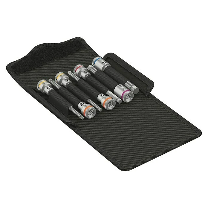 Der Steckschlüsseleinsatz-Set Bicylce 8 von Wera beinhaltet 7 Bit-Nüsse, die für gängige Arbeiten am Fahrrad geeignet sind, inklusive einer Haltefunktion für Innensechskantschrauben. Durch die besonders schlanke Ausführung ist das Werkzeug für schwer zugängliche Arbeitsbereiche, beispielsweise für Tretlager wie gemacht. Die Größen sind farblich gekennzeichnet, somit wird die Ordnung und das Finden der richtigen Größe erleichtert. Die geriffelte Prägung am hinteren Teil des Bits sorgt für gute Griffigkeit. Dank des Klettverschlusses auf der Rückseite können Sie die Tasche am Wera 2go System befestigen.