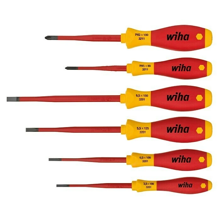 Das Schraubendreher-Set SoftFinish electric slimfix von Wiha besteht aus sechs Schraubendrehern, die sich durch ihre hohe Qualität und eine lange Lebensdauer auszeichnen. Im Set sind sechs Schraubendreher enthalten, die durch ihre VDE-Prüfung für viele gängige Arbeiten in der Elektroinstallation eingesetzt werden können. Die hochwertige Fertigung in Verbindung mit der VDE-Zulassung erlaubt Arbeiten an spannungsführenden Komponenten bis zu 1.000 V AC. Die Klingen der Schraubendreher sind besonders schlank gestaltet, sodass auch in engen Schraubenführungen gearbeitet werden kann. Der ergonomische Griff ist mit einem Abrollschutz versehen, sodass die Schraubendreher an ihrer Position liegen bleiben und auch auf schrägen Flächen nicht wegrollen. Um einen guten Komfort auch bei längerem Arbeiten zu gewährleisten sind die Griffe aus Mehr-Komponenten-Material hergestellt, was zusätzlich eine optimierte Griffigkeit bietet.